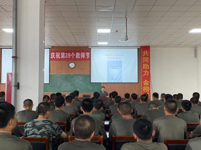 为持续巩固深化“汤阴经验”,增强新兵法治观念,提升新兵法律素养,9月11日,汤阴法院走进新兵训练场地开展“送法助征兵”活动,为2023年秋季预定新兵开展法治教育。