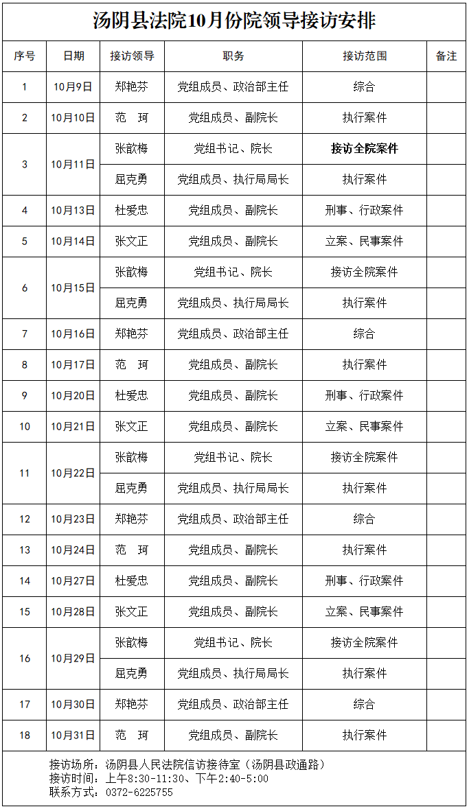 为认真贯彻落实院领导接访制度,进一步畅通群众信访渠道,依法及时解决群众合理合法诉求,现将汤阴县人民法院2025年10月份院领导接访信息公示如下: