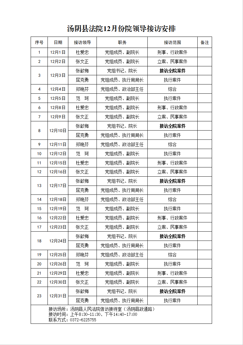 为认真贯彻落实院领导接访制度,进一步畅通群众信访渠道,依法及时解决群众合理合法诉求,现将汤阴县人民法院2025年12月份院领导接访信息公示如下:
