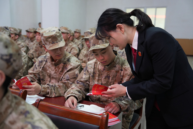 通过PPT宣讲,法院干警首先向新兵们介绍了汤阴县法院“法院牵头、多部门联动”的全方位涉军维权体系。围绕婚姻家庭、财产保护、人身侵权、涉军反诈四大核心法律场景,详细讲解了军婚特殊保护、彩礼返还、远程维权、证据留存、案件“绿色通道”等实操要点与维权路径。同时手把手传授了“找对渠道、备好材料、享受专属保障”的维权三步法,明确告知涉军维权专线0372-6225791与全国反诈专线96110的使用场景。并针对汤阴县法院“涉军维权”的“四快一优先”机制、司法救助、跨区域协同处置等配套保障措施进行了重点说明。用专业高效的普法宣讲筑牢军人军属合法权益防线,为国防和军队建设保驾护航。
