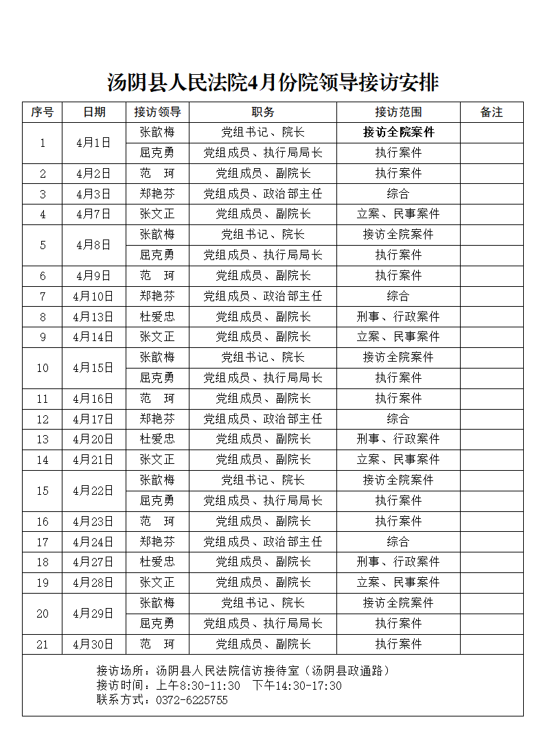 汤阴县人民法院2026年4月份院领导接访公示